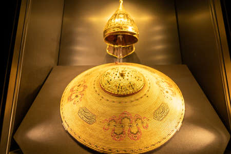 historical golden helmet and shield of Ottoman Turks produced in 16th century and displayed in Topkapi Palace Museum, Fatih, Istanbul, Turkey - 04.05.2021