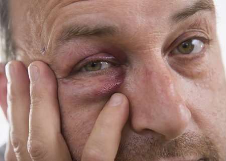 close view of a bruise near the eye, the face of a man with a hematoma
