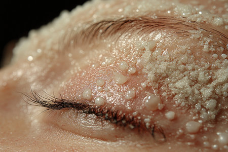 Close-up of a human eye covered in glistening crystals and droplets