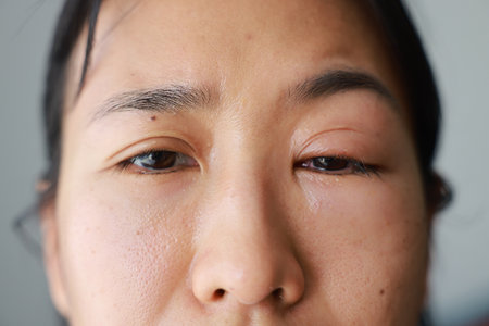Close up of Asian young man with brown eye with stye infection. Eyelid abscess, hordeolum in medical health, disease and treatment concept.