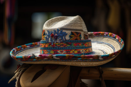 A beautifully crafted sombrero sits alongside a traditional hat, both showing intricate patterns and vibrant colors in a bright, cultural setting, inviting admiration.