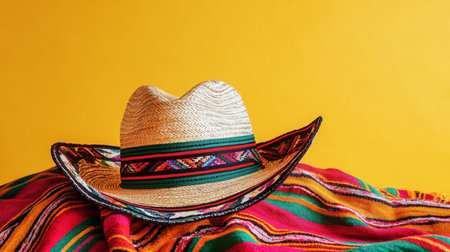 Straw hat on vibrant Mexican blanket with yellow backdrop