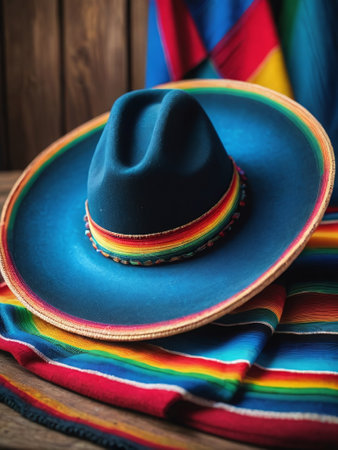 Photograph Of Sombrero On Serape And Blue Wood. Generative AI
