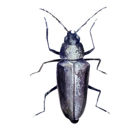 Bug watercolor illustration. Black beetle with a mustache painted in watercolor.