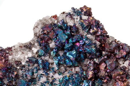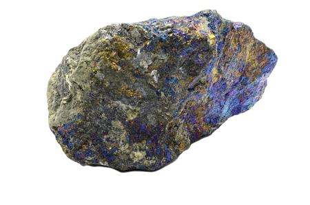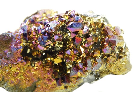 Iridescent chalcopyrite (also known as rainbow chalcopyrite) on a white background