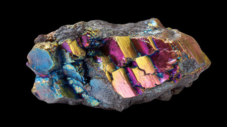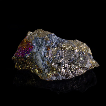 Focused macro raw colourful golden, pink and purple chalcopyrite isolated on gray background isolated