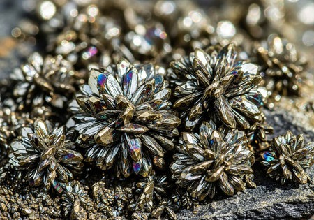 Pyrite is a brilliant mineral known for its golden hue and characteristic crystalline shapes, close-up.