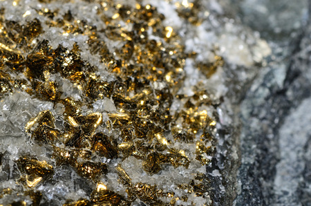 Chalcopyrite, It has the chemical formula (CuFeS2). Copper iron sulfide mineral. Macro. Beautiful fantastic background for successful business projects.