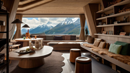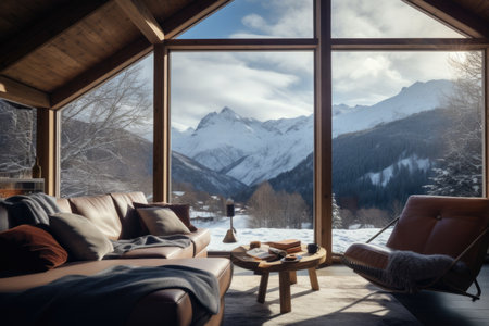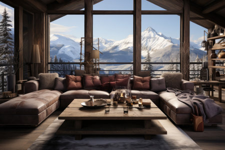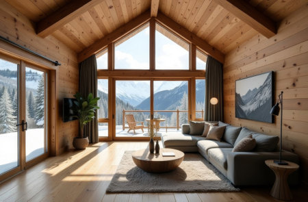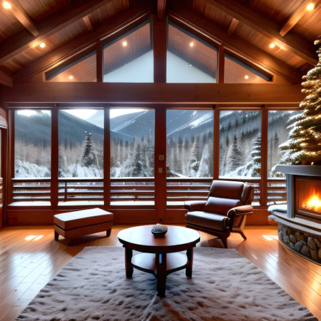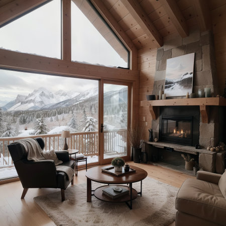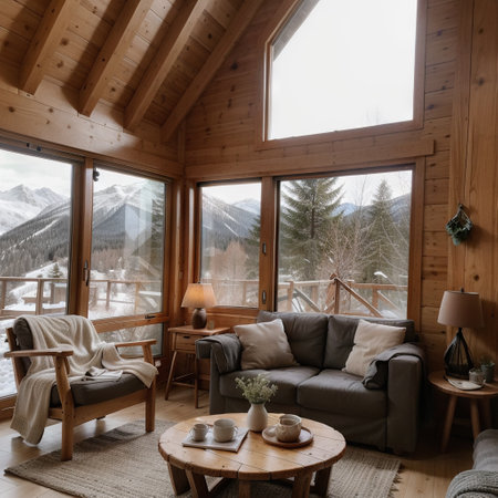 Enjoy the modern design of a cozy mountain cabin interior featuring large windows showcasing breathtaking mountain views. A perfect retreat for relaxation.