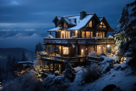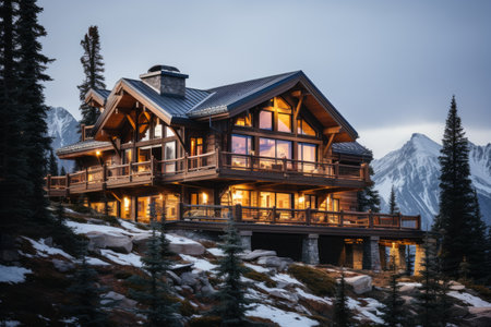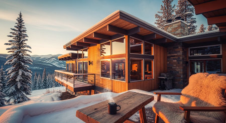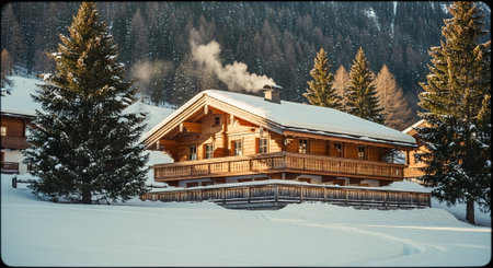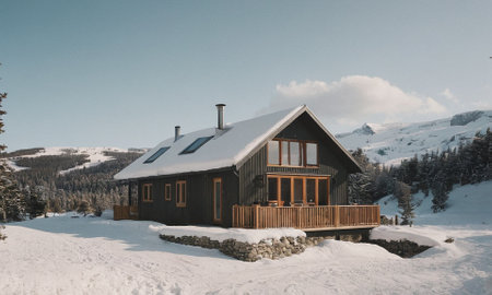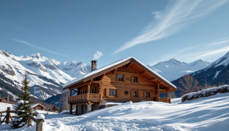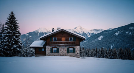 Beautiful wooden cabin nestled in a winter wonderland, surrounded by majestic mountains and evergreen trees, offering a peaceful retreat in nature's embrace.