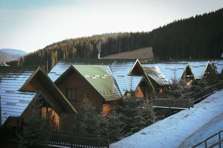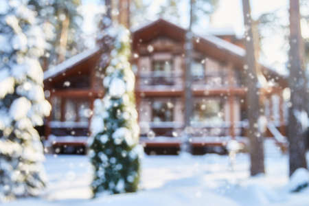 Typical landscape of the mountains with private estates in winter. Full length view of the winter house with woods in snow. Stock photo