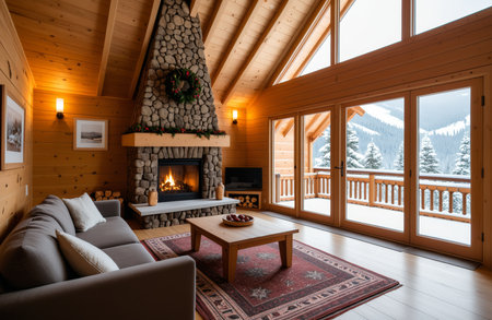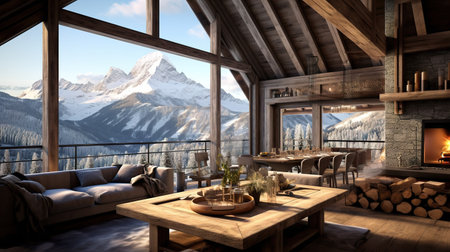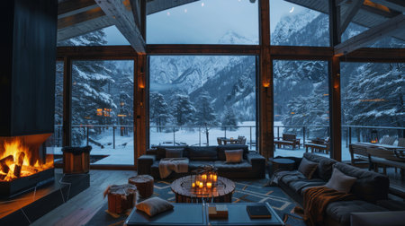 Interior of a modern chalet in the mountains with a fireplace and Winter