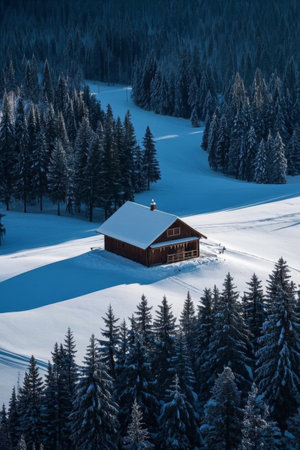 A rustic wooden cabin sits peacefully surrounded by a winter wonderland landscape.