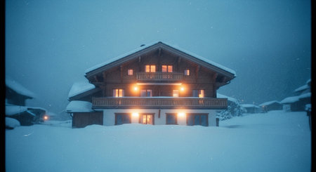 winter holidays, ski vacations background, wooden house under snow in the Alps
