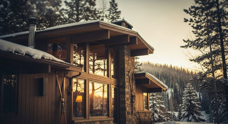 Exterior view of a scandinavian chalet covered by snow in middle of forest on sunny day created using generative AI technology