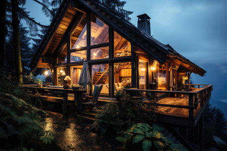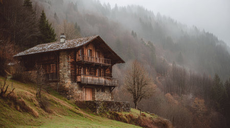 A cozy wooden cabin stands surrounded by dense greenery and towering trees in the mountains. Early morning fog adds a mystical touch to this tranquil retreat.