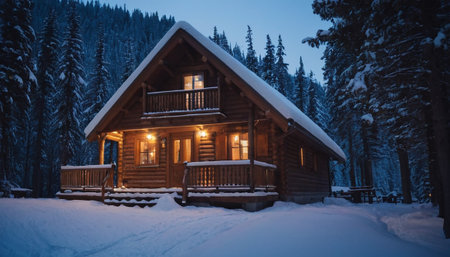 A charming cabin surrounded by tall trees and fresh snow, illuminated warmly from within as twilight descends on the winter landscape.