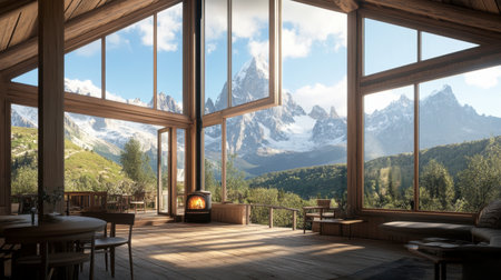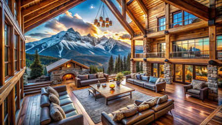 A scenic mountain lodge with rustic wooden beams, large windows, and a cozy, inviting atmosphere.