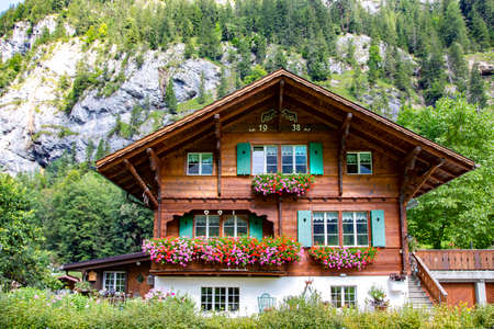 Ancient wooden house in the mountains overgrown with forest of Bernese Oberland, Switzerland. Typical wooden architecture of Switzerland.