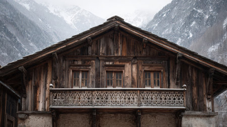 The weathered wooden facade of a traditional alpine house, featuring multiple windows and a detailed, ornate balcony. Snow-covered mountains loom in the background during winter.