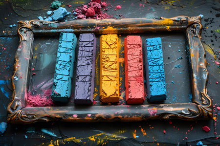 Vibrant multi-colored chalk sticks arranged inside a rustic picture frame. the scene is set against a dark background with splatters of chalk dust, creativity, art projects, and diy aesthetics. Generative AI
