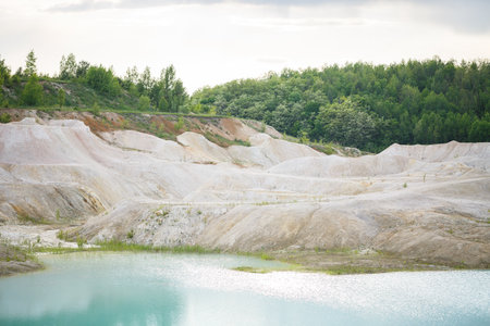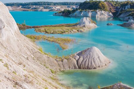 Chalk mining in an industrial quarry at Krasnoselsky village in the Belarus. Mountain lake or river with a turquoise or blue tint of water in a rock canyon. Turquoise background of the clear river