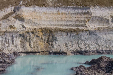 Clay mining. Beautiful background of white clay. Blue water.
