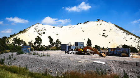 Excavator in front of white overburden