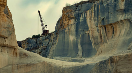An old, rusty crane sits perched atop a rugged limestone quarry. The stone formations are dramatic, showing layers and textures from years of erosion.