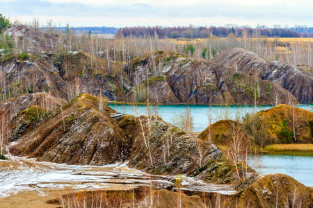 Autumn natural landscape. Abandoned coal quarries near Konduki village, Tula oblast, Romantsevskie mountains, Russia.