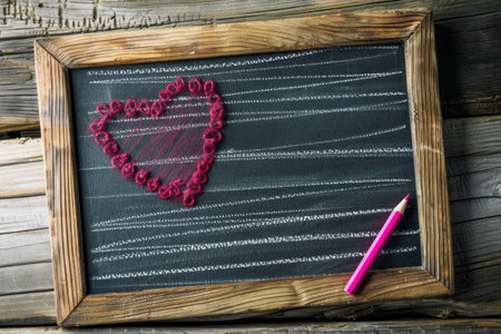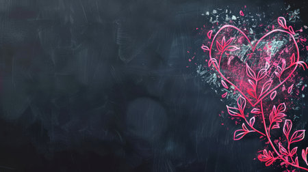 Hand-drawn pink heart on blackboard background with leaf patterns. Concept of love, romance, Valentine s Day, hand drawn design. Copy space.