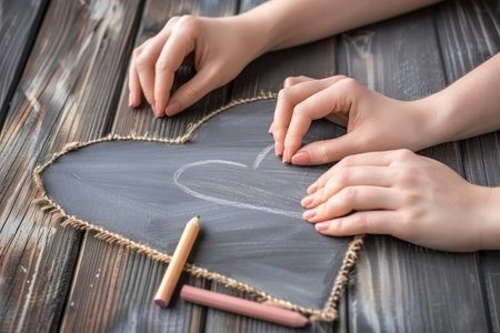 Close up of woman hand writing drawing heart sign emoji on chalkboard. Education and science concept.