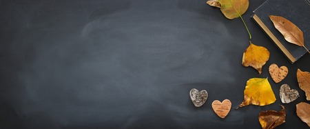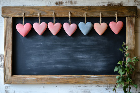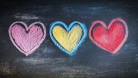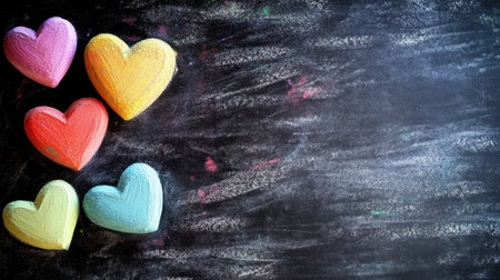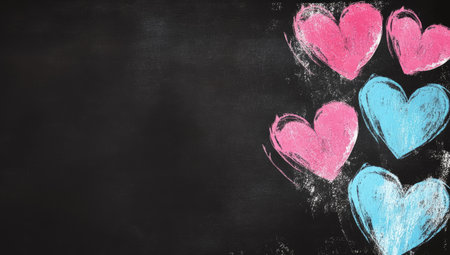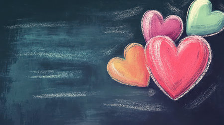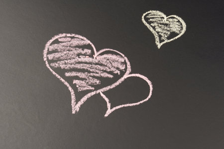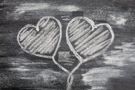 Hearts drawn in white chalk on a blackboard, background image with copy space