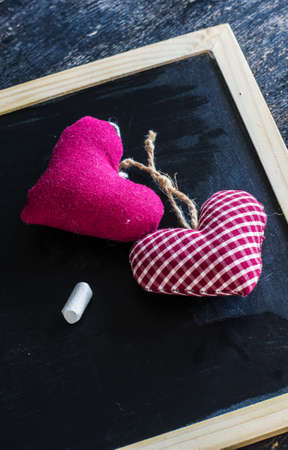 Heart drawing on school chalkboard. Love, valentine day symbol. Two red hearts small and big size hand drawn on black board