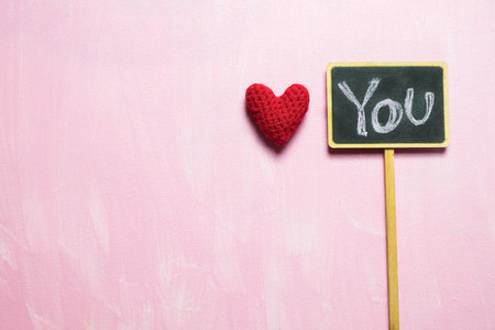 Red crochet and a blackboard is wrote You to mean love You on pink painted canvas background
