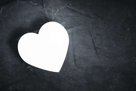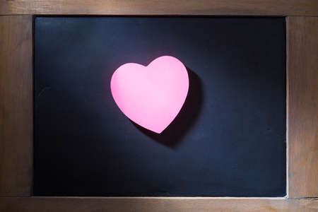 Empty pink hearted shape sticky note on blackboard with concentrated light beam for dramatic feel, vintage retro look