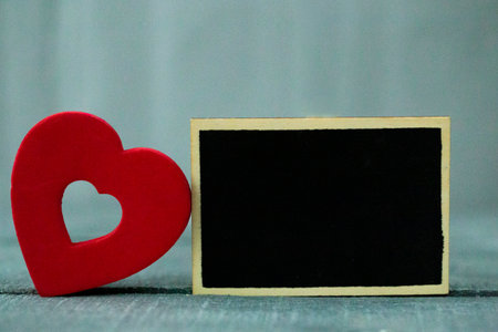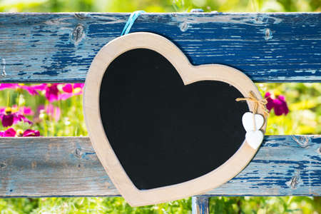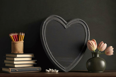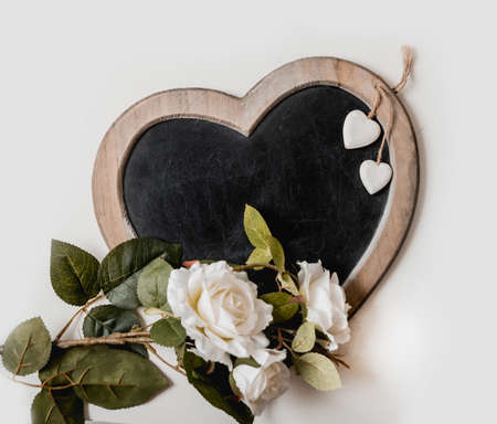 Mock up of greeting card. Empty chalk board heart shaped with flowers and inscription love. Flat lay composition. Top view with copy space