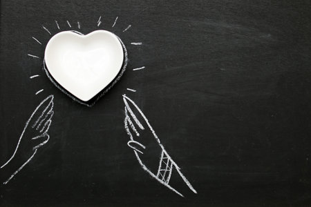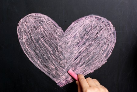 man's hand with white chalk drawing heart on blackboard as love symbol