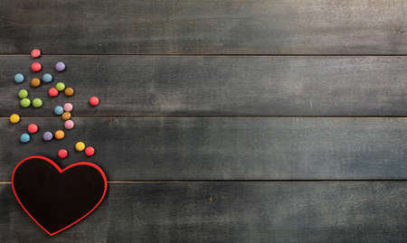 Romantic love. Heart shaped blackboard and candies on a wooden background, top view and copy space.