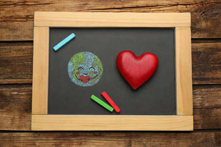 Happy Earth Day. Blackboard with drawing of planet, decorative heart and chalk pieces on wooden table, top view