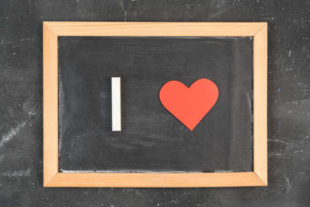 I Love. Text on a chalkboard using white chalk and a red heart symbol, top view.