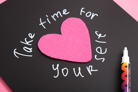 inscription take time for yourself and felt heart, text with white chalk marker on black board, motivation for the day, top view, close-up