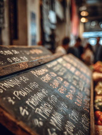 Chalk signage at a market features faded prices, enhancing the lively atmosphere as shoppers browse fresh goods in a warm, inviting setting.