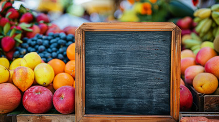 Farmers market stall with a variety of organic fruits. Board with wooden frame for text. Copy space. Generative AI.