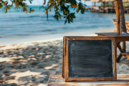 Blank menu board in front of a beach bar. Blackboard at the summer beach restaurant