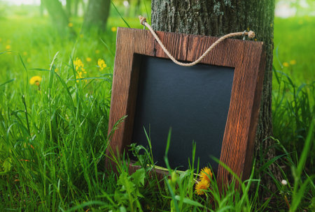 Rustic wooden empty chalkboard leans on tree in green grass offers empty copyspace