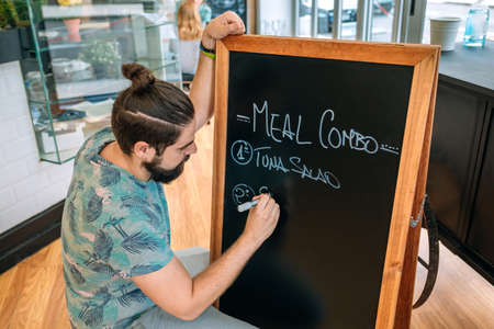 Young waiter writing the daily menu on a blackboard
