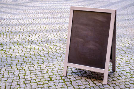 Chalkboard sign on the sidewalk, cafe, restaurant on the road surface.