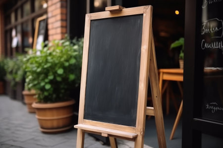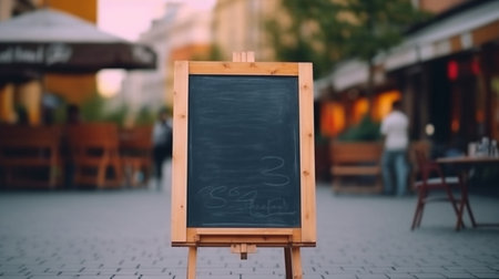 Empty blackboard placed against blurred cafe background. Generative AI