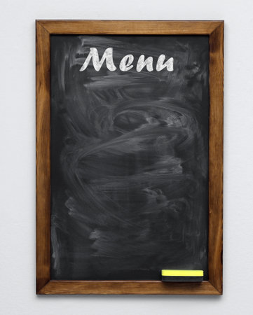 Black chalkboard with word Menu on white background. Mockup for design